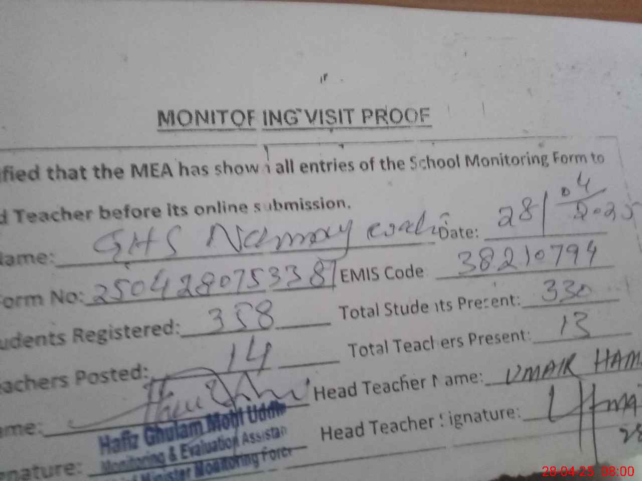 | EMIS Code: 38210794 | Name of School: GHS NAMAY WALI | |||