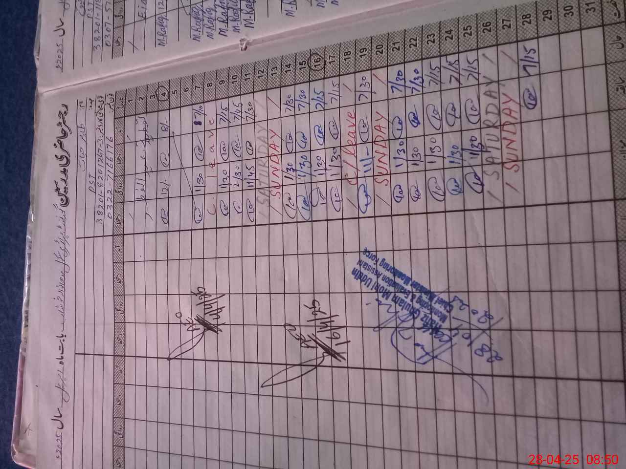 | CNIC | Full Name | Designation | R/C | Absence during last cal. month |