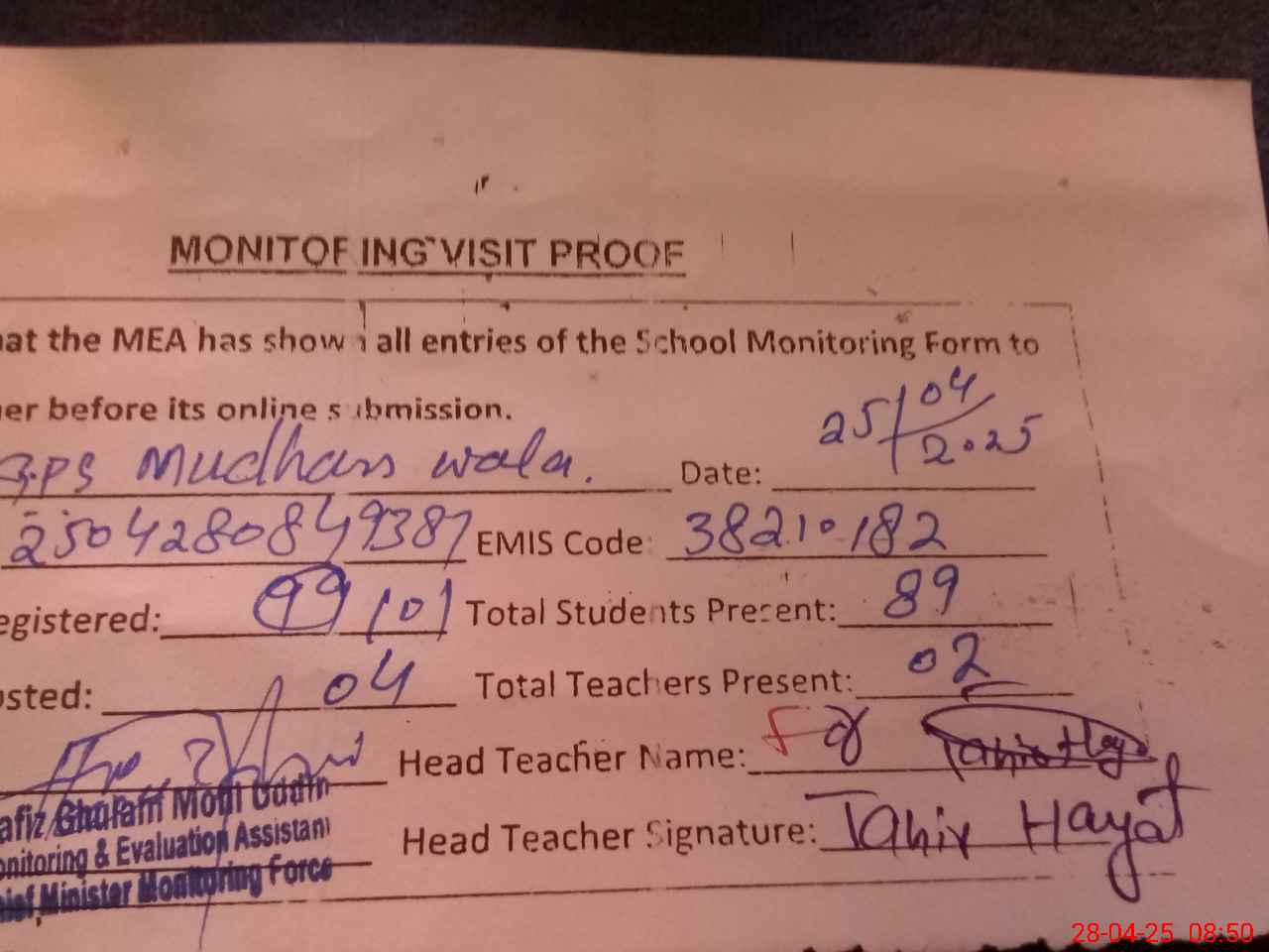 | Attendance Register | Head Teacher | MEA with School | Visit Proof |
