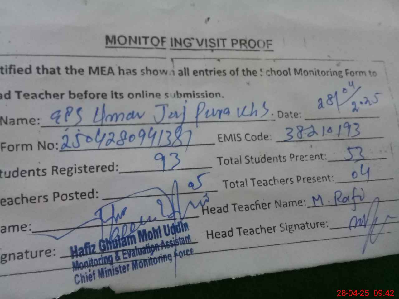 | Attendance Register | Head Teacher | MEA with School | Visit Proof |