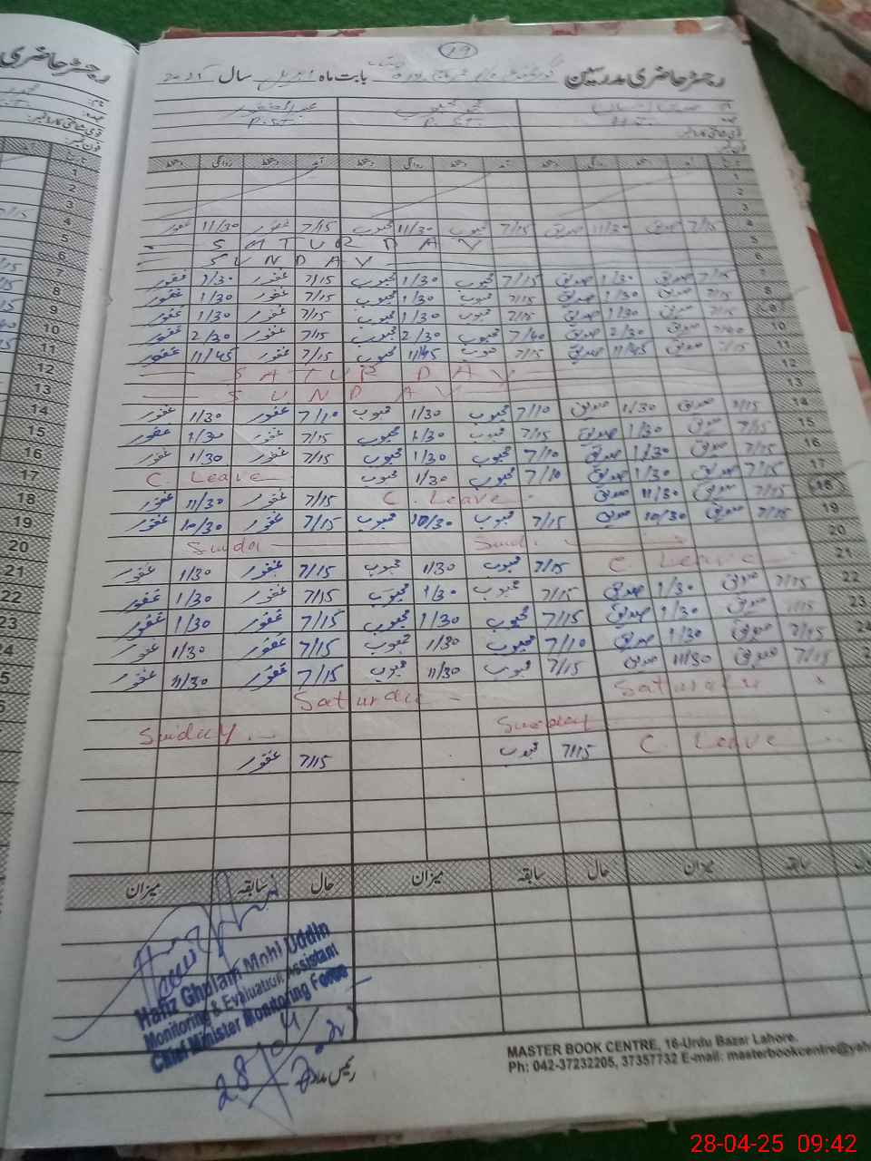| CNIC | Full Name | Designation | R/C | Absence During Last Calender Month |