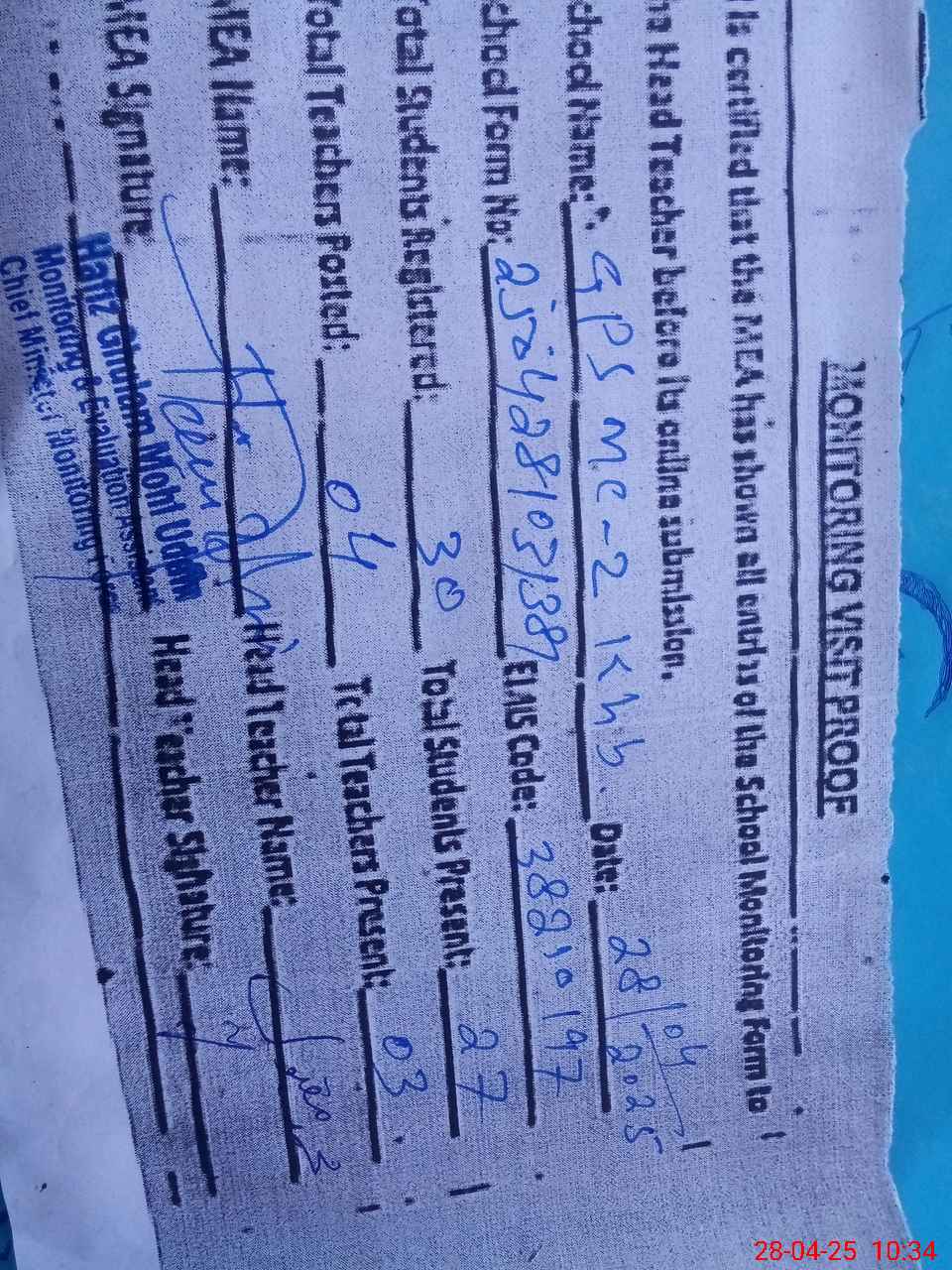 | Attendance Register | Head Teacher | MEA with School | Visit Proof |