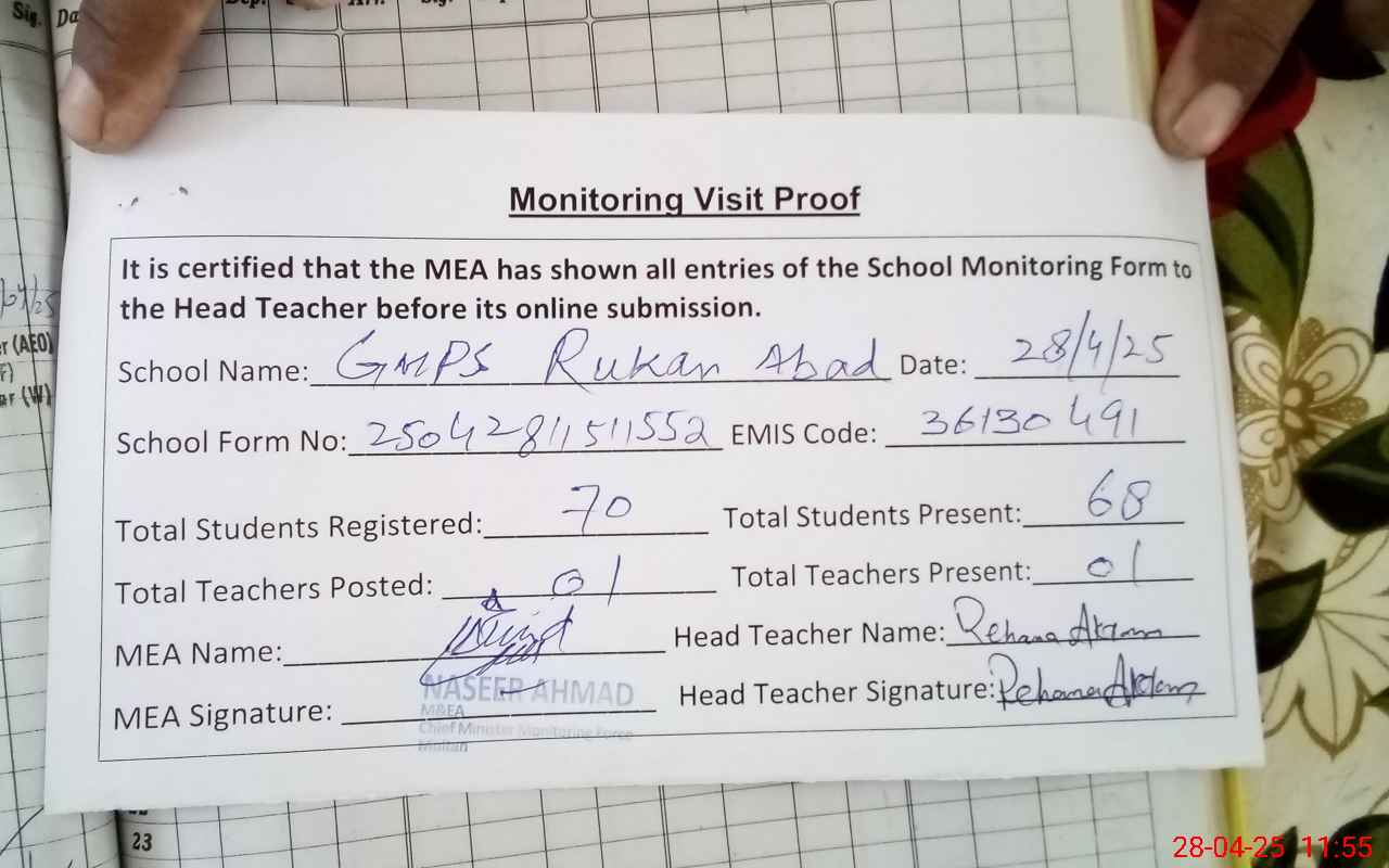 | Monitoring Date: 28-04-2025 | Start Time: 28-04-2025 11:37 AM | End Time: 28-04-2025 11:55 AM | Name of MEA: Na**** Ah**** | |