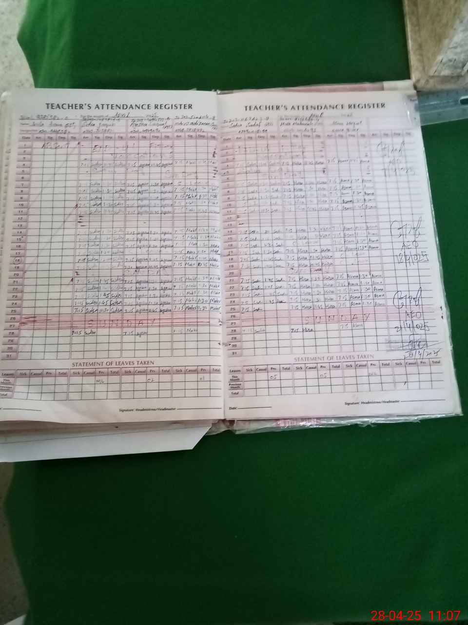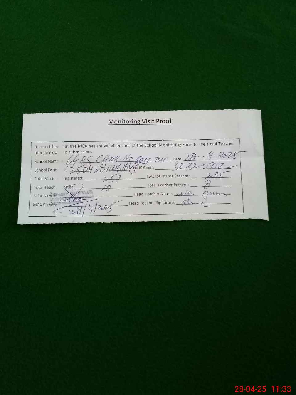 | Attendance Register | Head Teacher | MEA with School | Visit Proof |