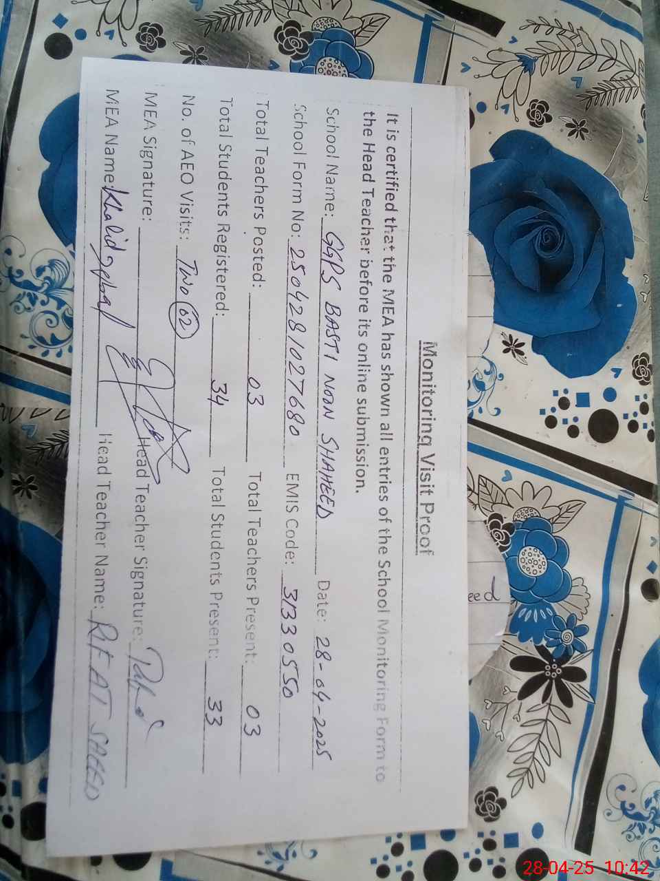 | Attendance Register | Head Teacher | MEA with School | Visit Proof |