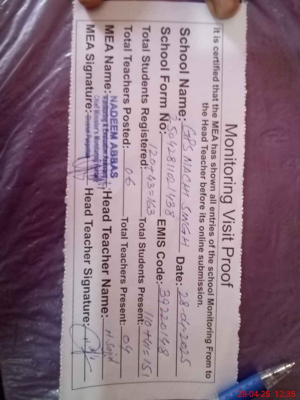 | Attendance Register | Head Teacher | MEA with School | Visit Proof |