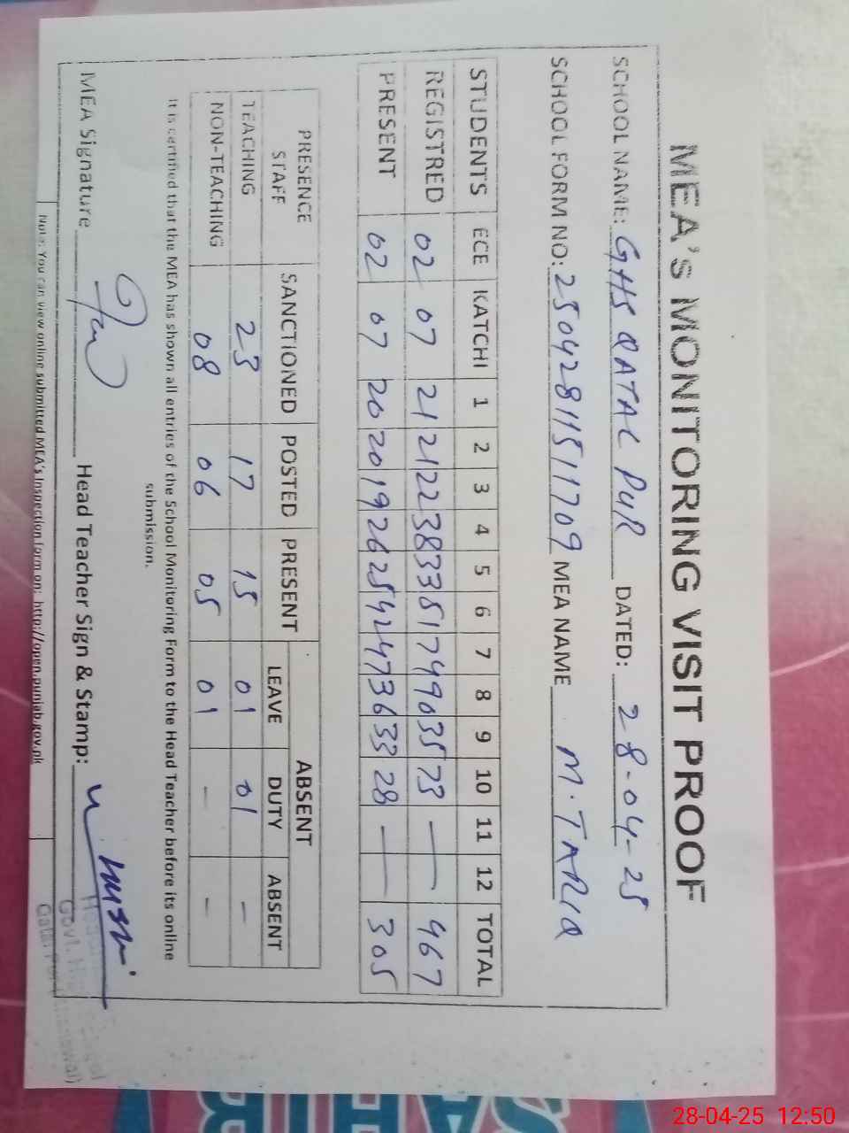 | EMIS Code: 36410020 | Name of School: GHS QATAL PUR, SARAI SIDHU | |||