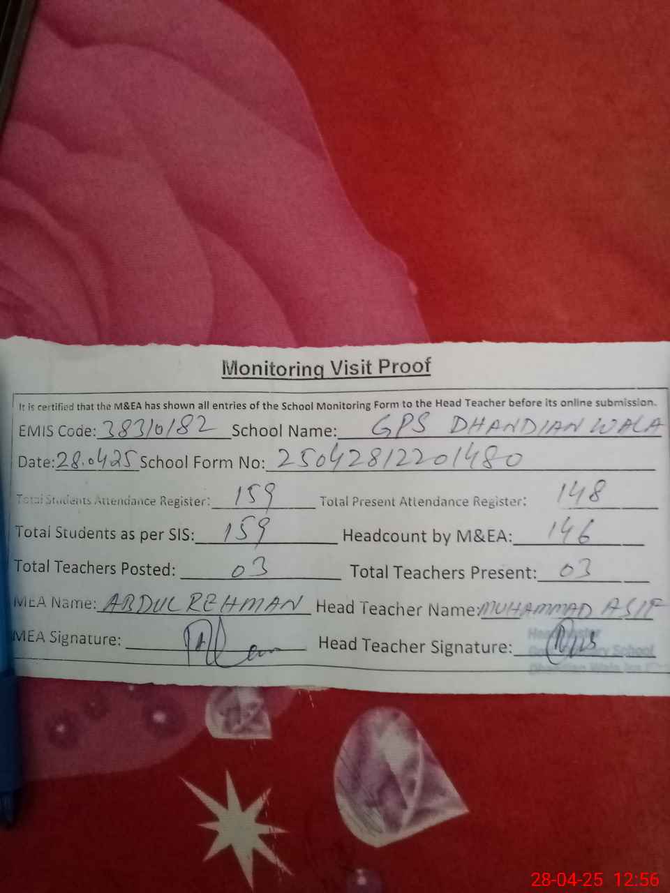 | Attendance Register | Head Teacher | MEA with School | Visit Proof |