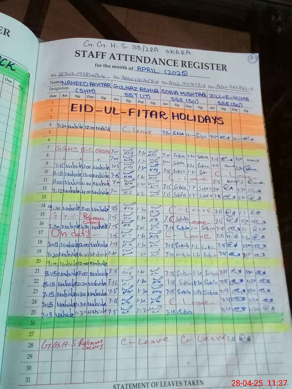 | Remarks (Use Separate Page if Required): 01 female teacher named shumaila pst attached from GGHS 22 GD to GGHS 38 2RA | |||||
