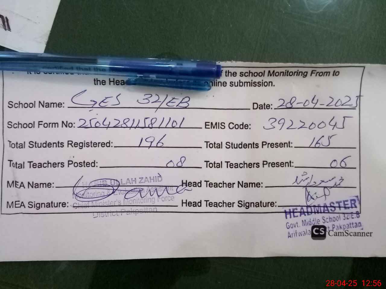 | Attendance Register | Head Teacher | MEA with School | Visit Proof |