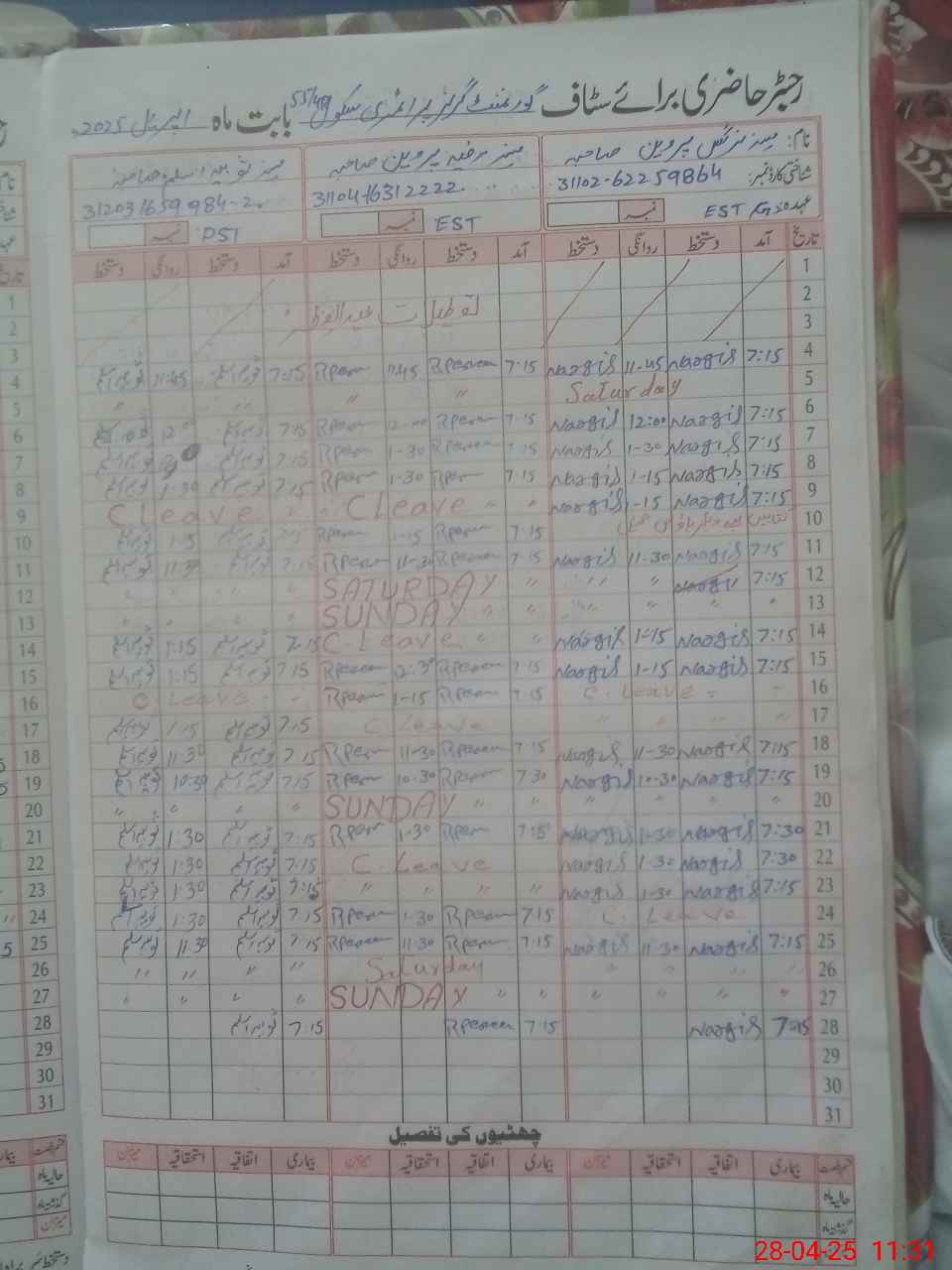 | CNIC | Full Name | Designation | R/C | Absence During Last Calender Month |
