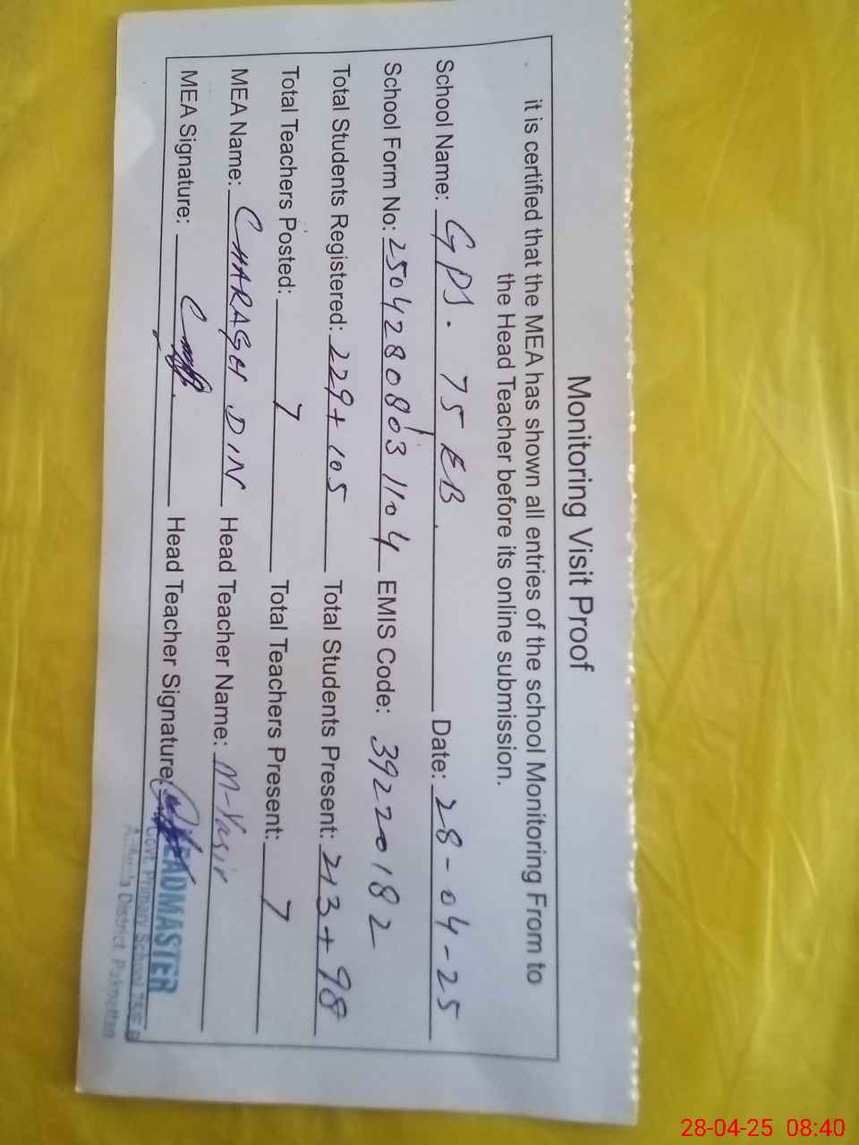 | Attendance Register | Head Teacher | MEA with School | Visit Proof |
