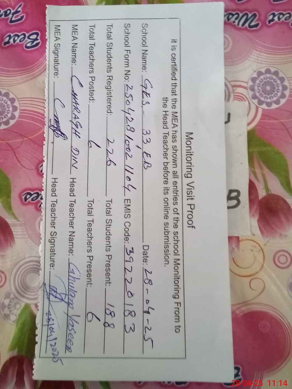 | Attendance Register | Head Teacher | MEA with School | Visit Proof |