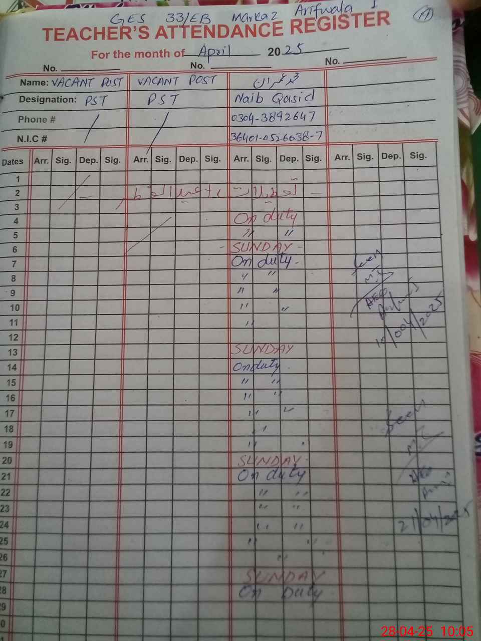 | CNIC | Full Name | Designation | R/C | Absence During Last Calender Month |