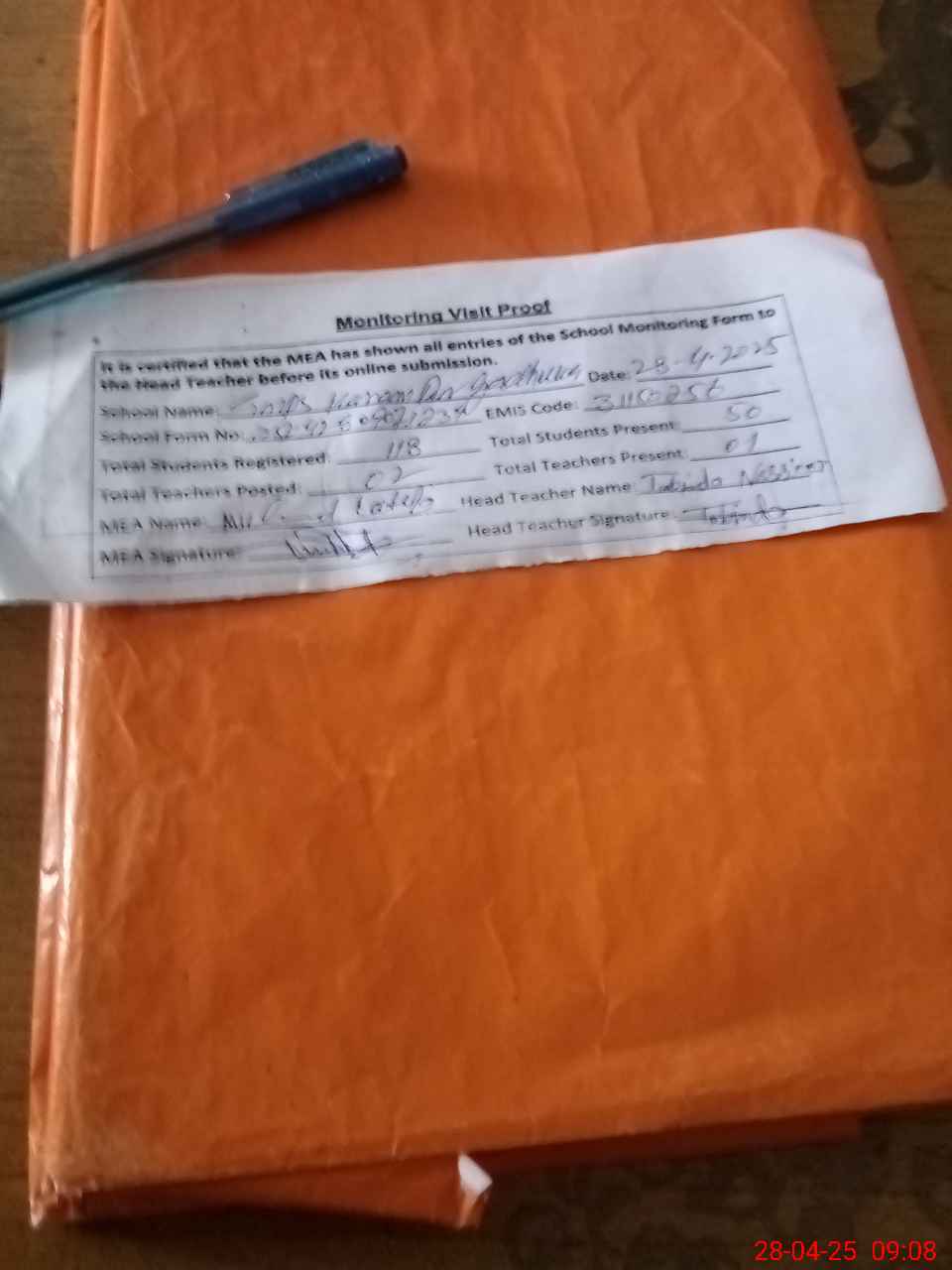 | Attendance Register | Head Teacher | MEA with School | Visit Proof |