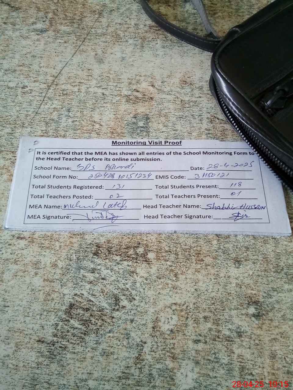 | Attendance Register | Head Teacher | MEA with School | Visit Proof |