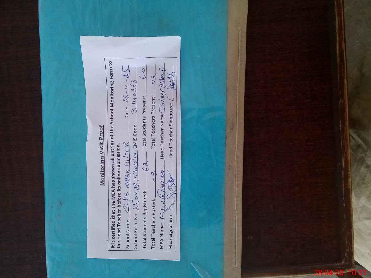 | Attendance Register | Head Teacher | MEA with School | Visit Proof |