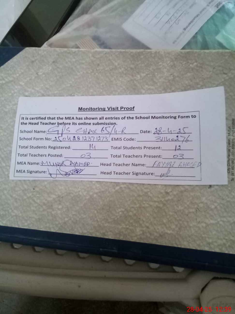 | Attendance Register | Head Teacher | MEA with School | Visit Proof |