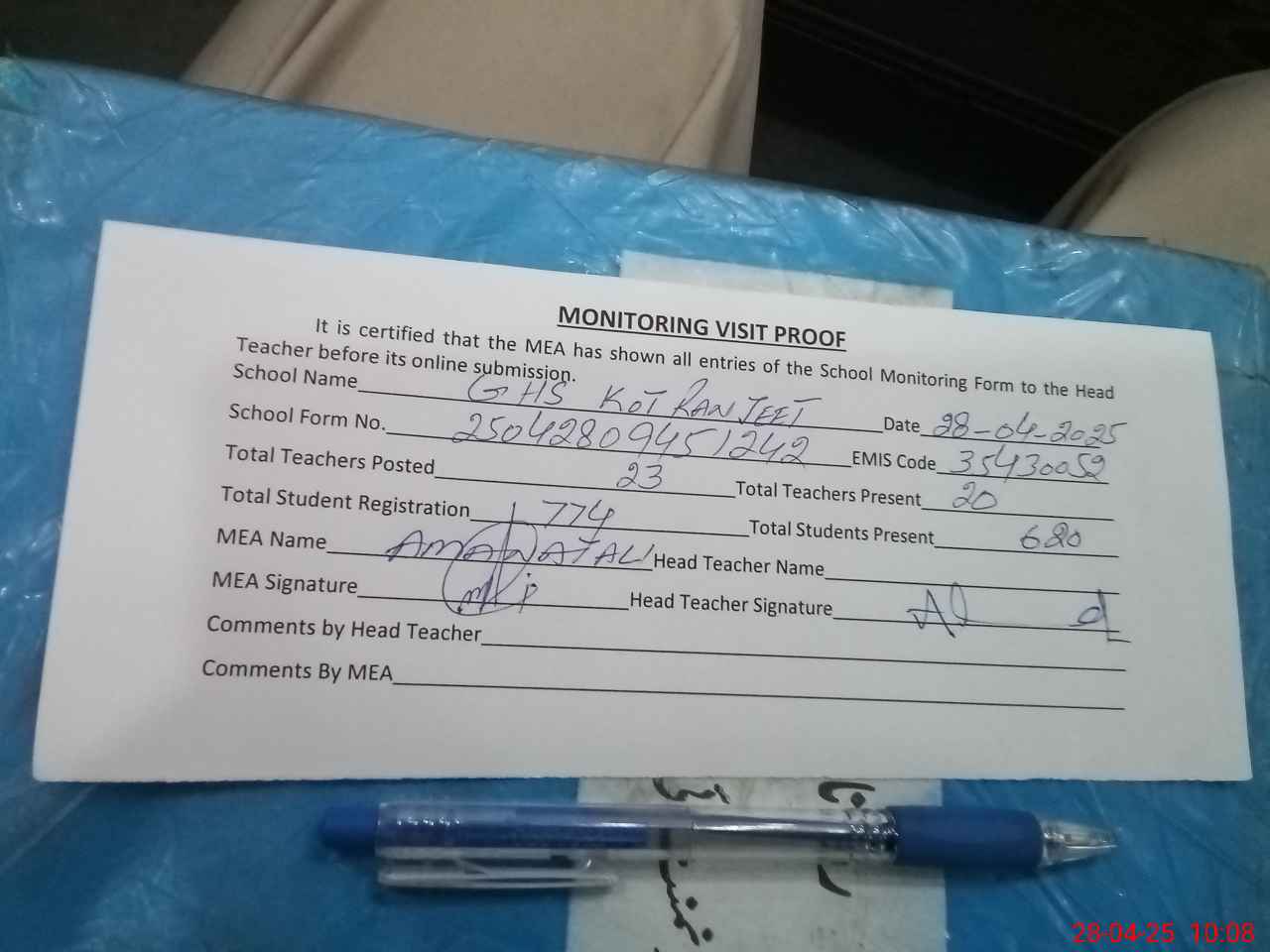 | Attendance Register | Head Teacher | MEA with School | Visit Proof |