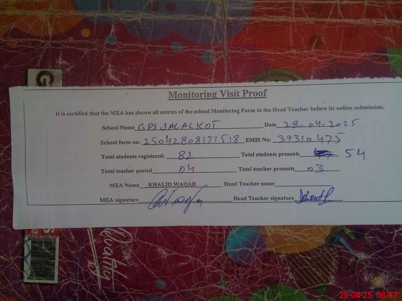| EMIS Code: 39310475 | Name of School: GPS JALAL KOT SANI | |||