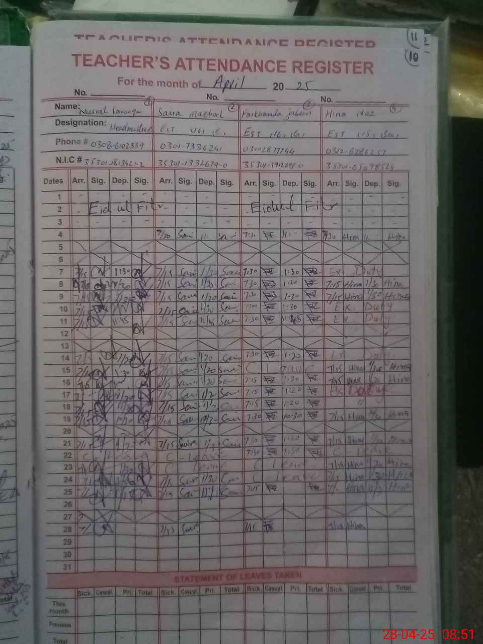 | Name: NU**** FA**** Designation: (School Headmaster's/Headmistress's) S.S.T.(Arts) Phone/Cell Number: 03**** |