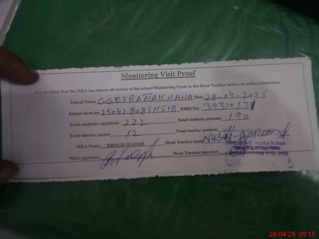 | Attendance Register | Head Teacher | MEA with School | Visit Proof |