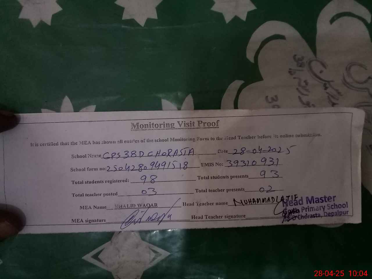 | Attendance Register | Head Teacher | MEA with School | Visit Proof |
