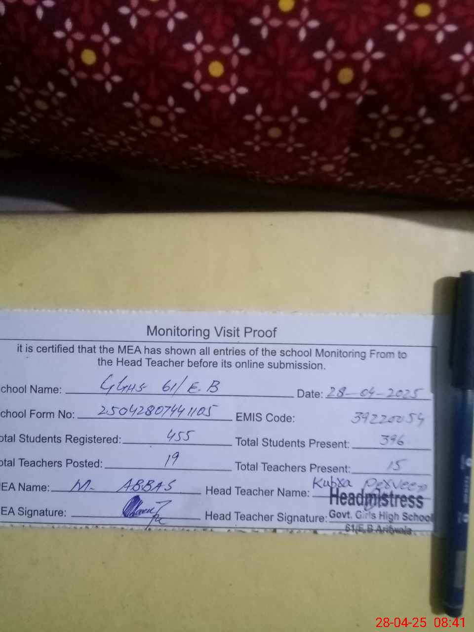 | EMIS Code: 39220054 | Name of School: GGHS 61 EB | |||