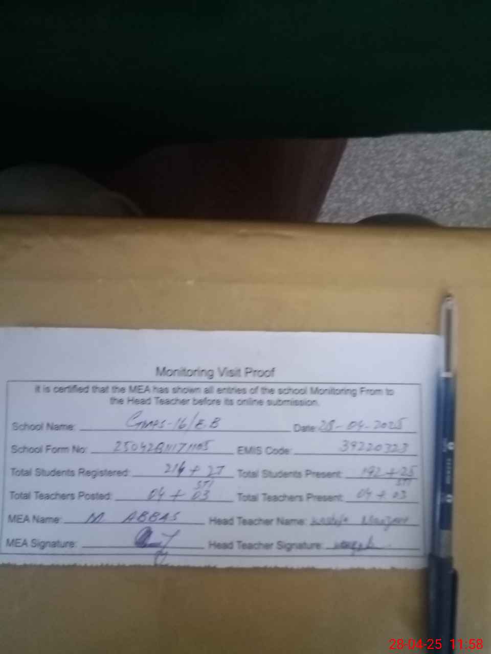 | Attendance Register | Head Teacher | MEA with School | Visit Proof |