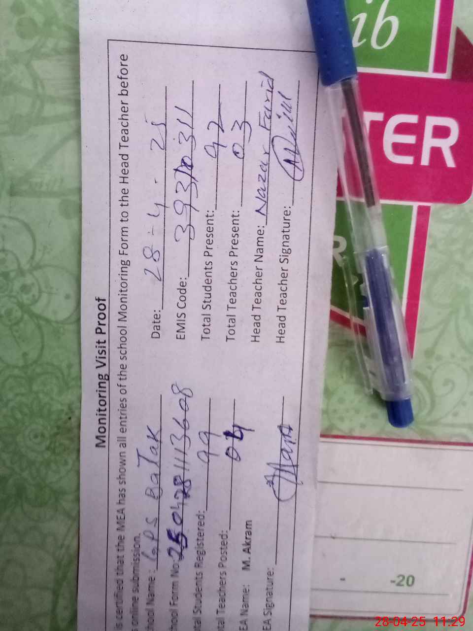 | Attendance Register | Head Teacher | MEA with School | Visit Proof |
