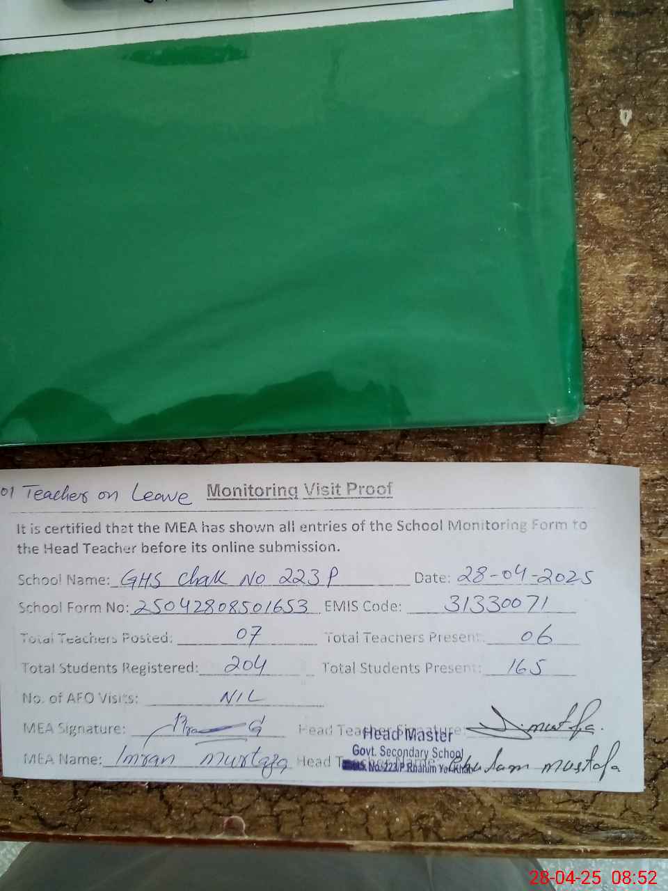 | Attendance Register | Head Teacher | MEA with School | Visit Proof |