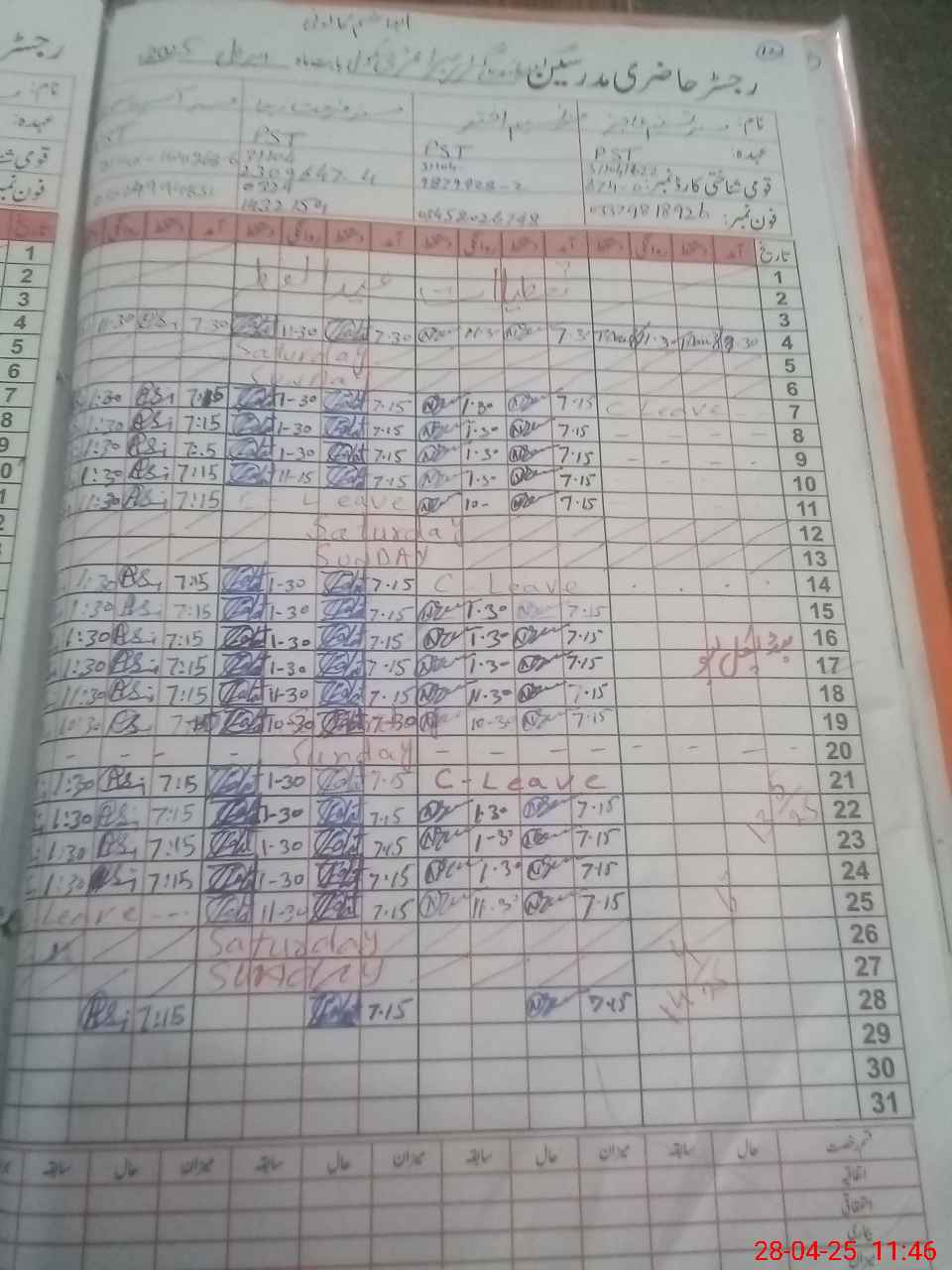 | CNIC | Full Name | Designation | R/C | Absence During Last Calender Month |