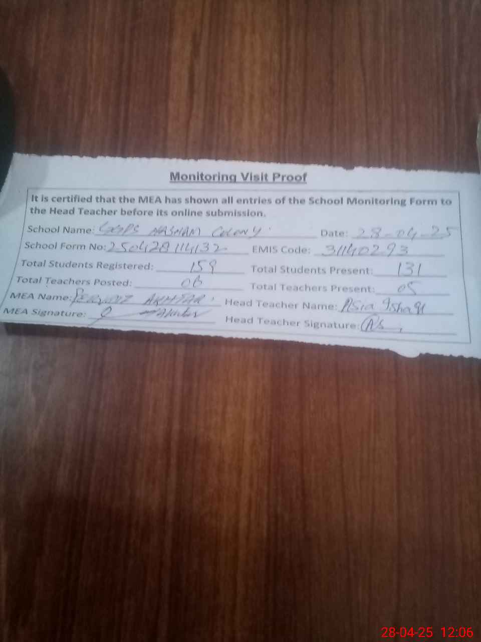 | Attendance Register | Head Teacher | MEA with School | Visit Proof |