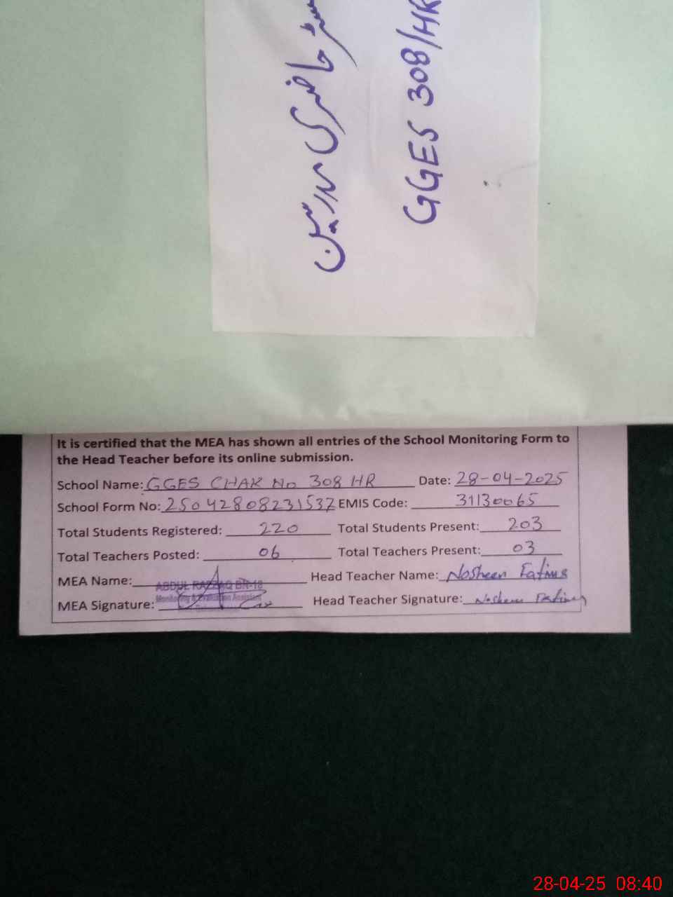 | EMIS Code: 31130065 | Name of School: GGES CHAK NO. 308 HR | |||