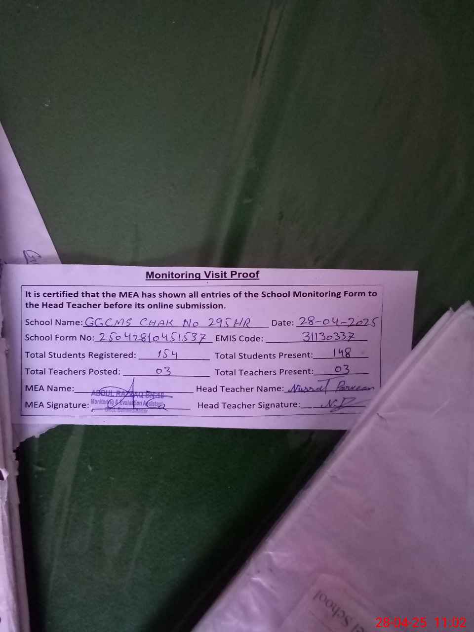 | EMIS Code: 31130337 | Name of School: GGCMS CHAK NO. 295 HR | |||