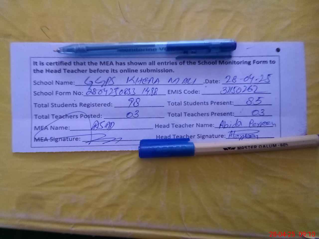 | Attendance Register | Head Teacher | MEA with School | Visit Proof |