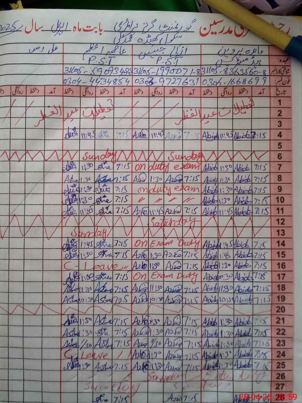 | Leave | Duty | Absent | Maternity | Medical | Ex- Pak |