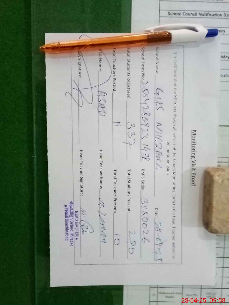 | Attendance Register | Head Teacher | MEA with School | Visit Proof |