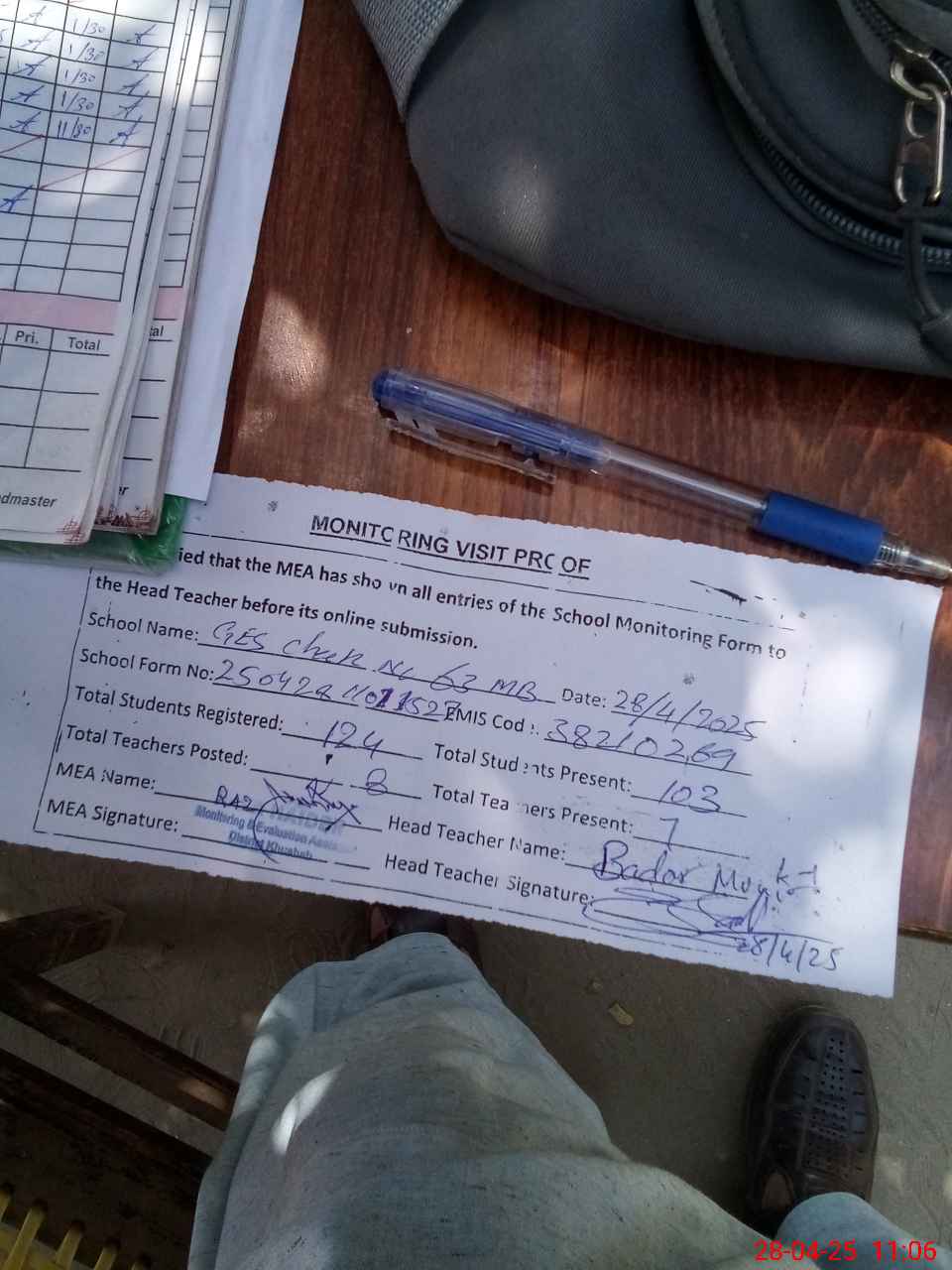 | Attendance Register | Head Teacher | MEA with School | Visit Proof |