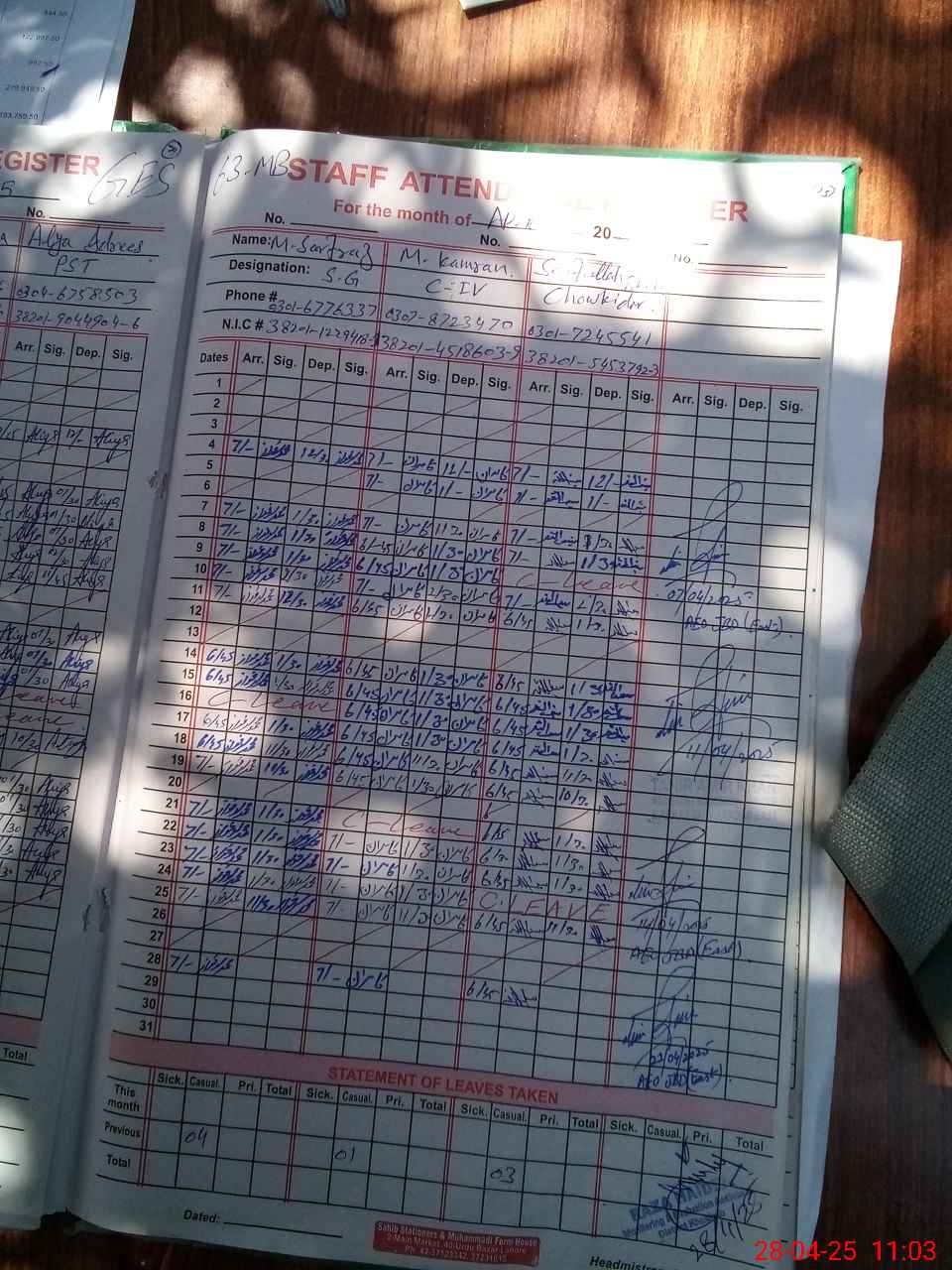 | CNIC | Full Name | Designation | R/C | Absence During Last Calender Month |