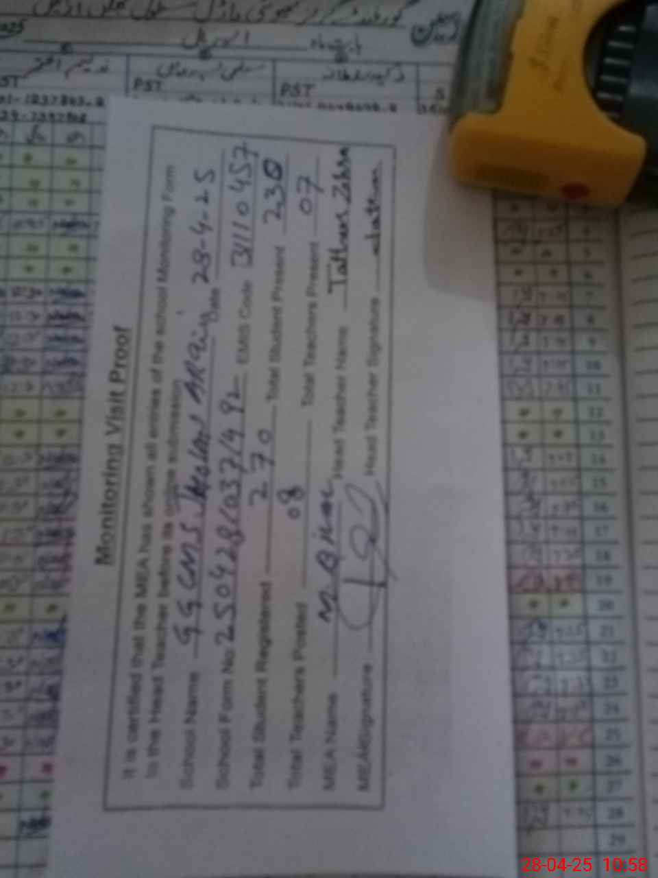 | Attendance Register | Head Teacher | MEA with School | Visit Proof |