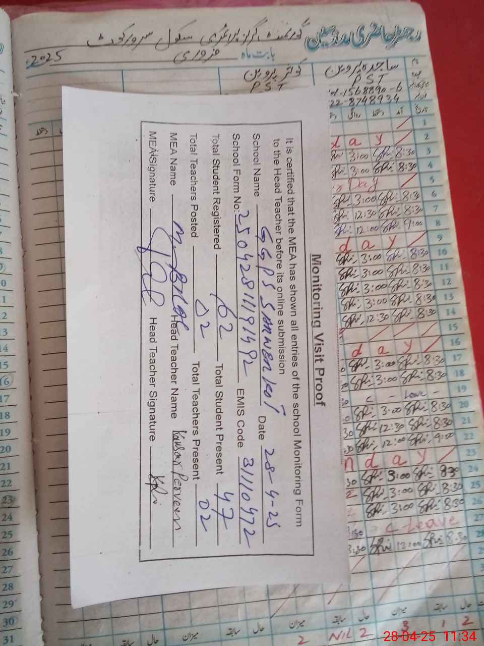 | Attendance Register | Head Teacher | MEA with School | Visit Proof |