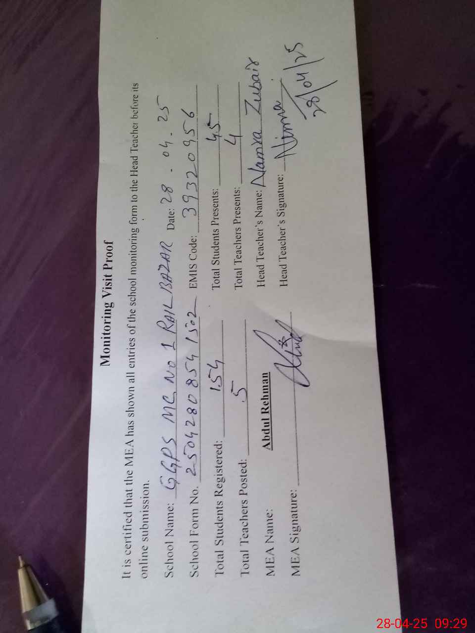 | Attendance Register | Head Teacher | MEA with School | Visit Proof |