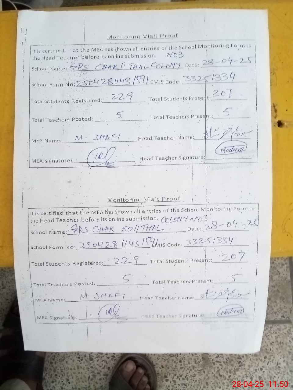 | Attendance Register | Head Teacher | MEA with School | Visit Proof |