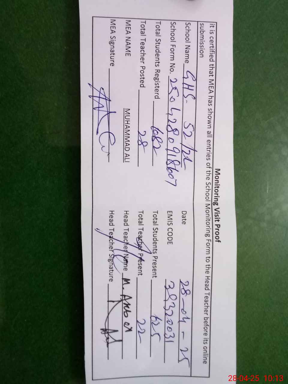 | Attendance Register | Head Teacher | MEA with School | Visit Proof |