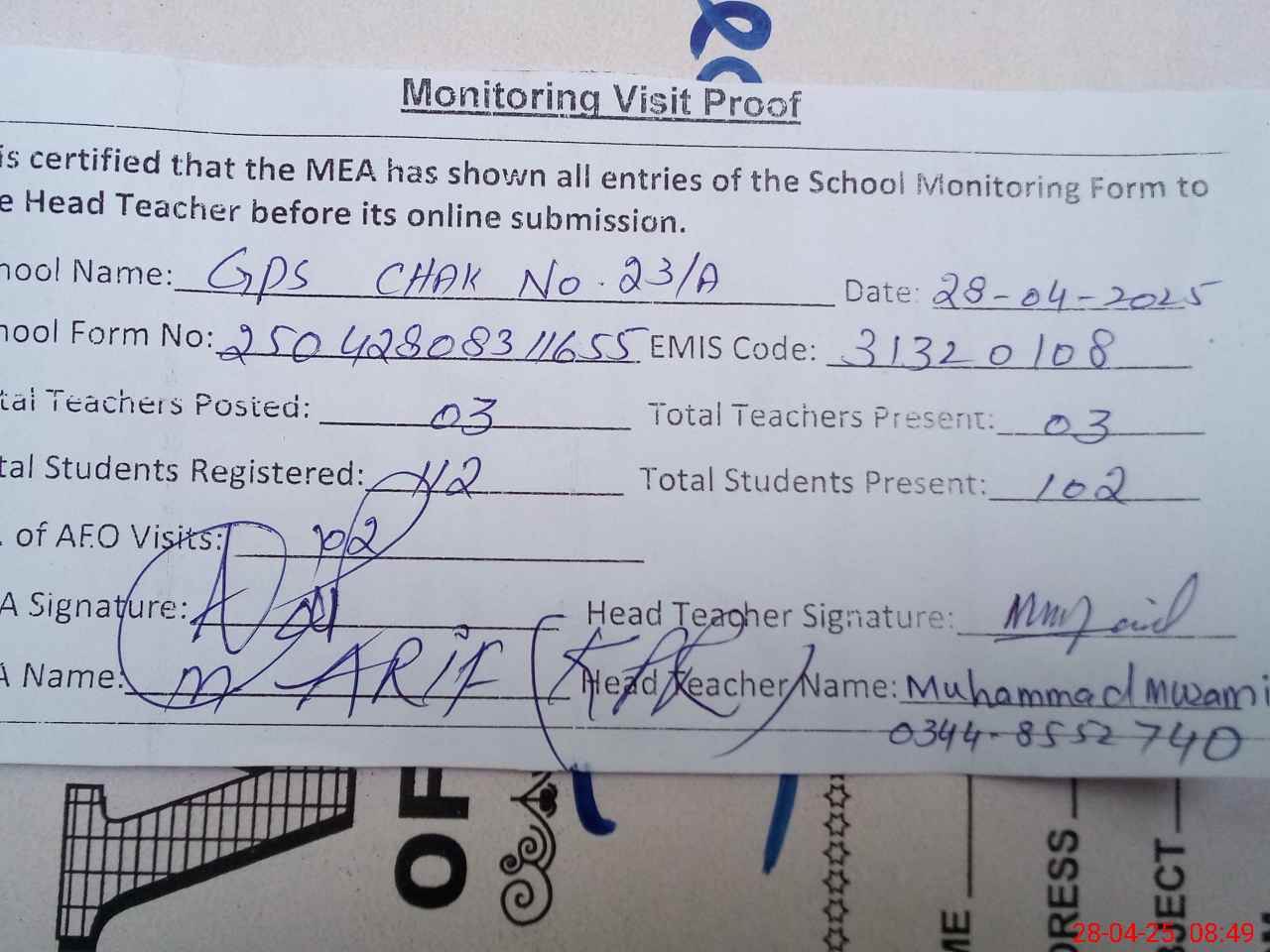 | EMIS Code: 31320108 | Name of School: GPS CHAK 23 A | |||