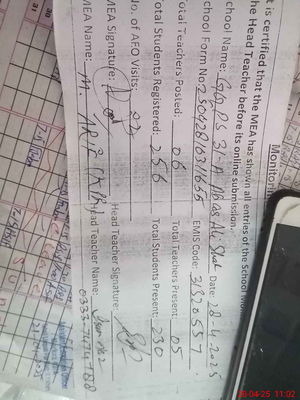 | Attendance Register | Head Teacher | MEA with School | Visit Proof |