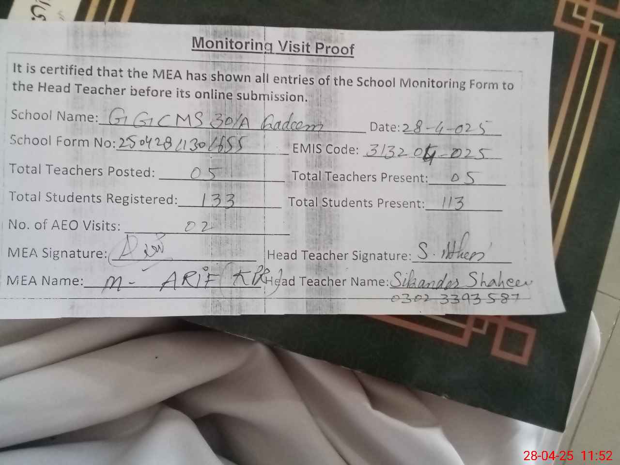 | Attendance Register | Head Teacher | MEA with School | Visit Proof |