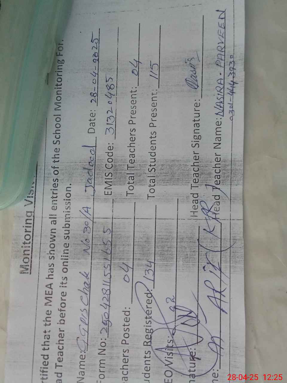 | Attendance Register | Head Teacher | MEA with School | Visit Proof |