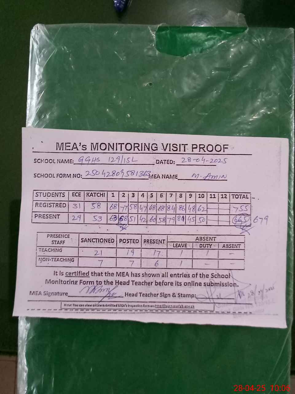 | Attendance Register | Head Teacher | MEA with School | Visit Proof |